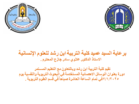 رعاية عميد كلية التربية ابن رشد للعلوم الانسانية الاستاذ الدكتور علاوي سادر جازع وبأشراف الاستاذ الدكتورة نادرة جميل مسؤولة الوحدة الارشادية في الكلية أقامت الوحدة الارشادية وبالتعاون مع التعليم المستمر دورة تدريبية بعنوان “الوسائل الاحصائية المستخدمة في البحوث التربوية والنفسية” في قسم العلوم التربوية والنفسية, حاضر فيها نخبة من الاساتذة.