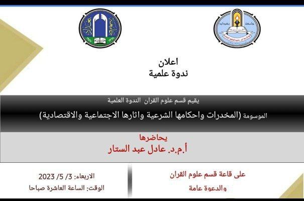 على بركة الله تعالى أقام قسم علوم القران والتربية الاسلامية صباح اليوم الاربعاء الموافق 2023/5/3 وعلى قاعة الدراسات العليا الندوة العلمية ( المخدرات واحكامها الشرعية واثارها الاجتماعية والاقتصادية)حاضر فيها الاستاذ المساعد الدكتور عادل عبدالستار ‘ وحضر الندوة مجموعة من الاساتذة والموظفين وطلبة الدراسة الاولية والعليا،
