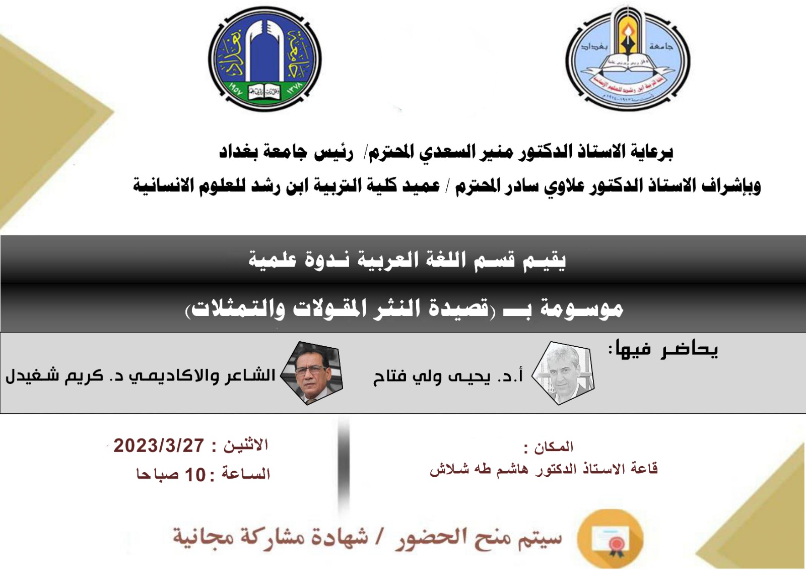 تمثل قصيدة النثر منعطفا مهما في تاريخ تنوع الجنس الشعري بتحولاتها الايدلوجية والبنيوية وبما تحمل من رؤى فكرية تشكل مسارا يحمل الكثير من الرموز والمعطيات التي تفسر التطور الاجناسي لتنوع الشعري لذلك تحاول الندوة تسليط الضوء على مجريات التحول الفكري والاسلوبي لهذه القصيدة