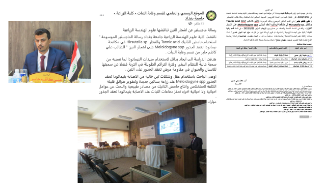 مناقشة رسالة طالب الماجستير ( علي كاظم جابر ) في القسم المذكور لموضوع رسالته الموسومة (تاثير حامض التانك Tannic acid والفطر Hirsutella sp. في مكافحة نيماتودا تعقد الجذور Meloidogyne spp على اشجار التين)