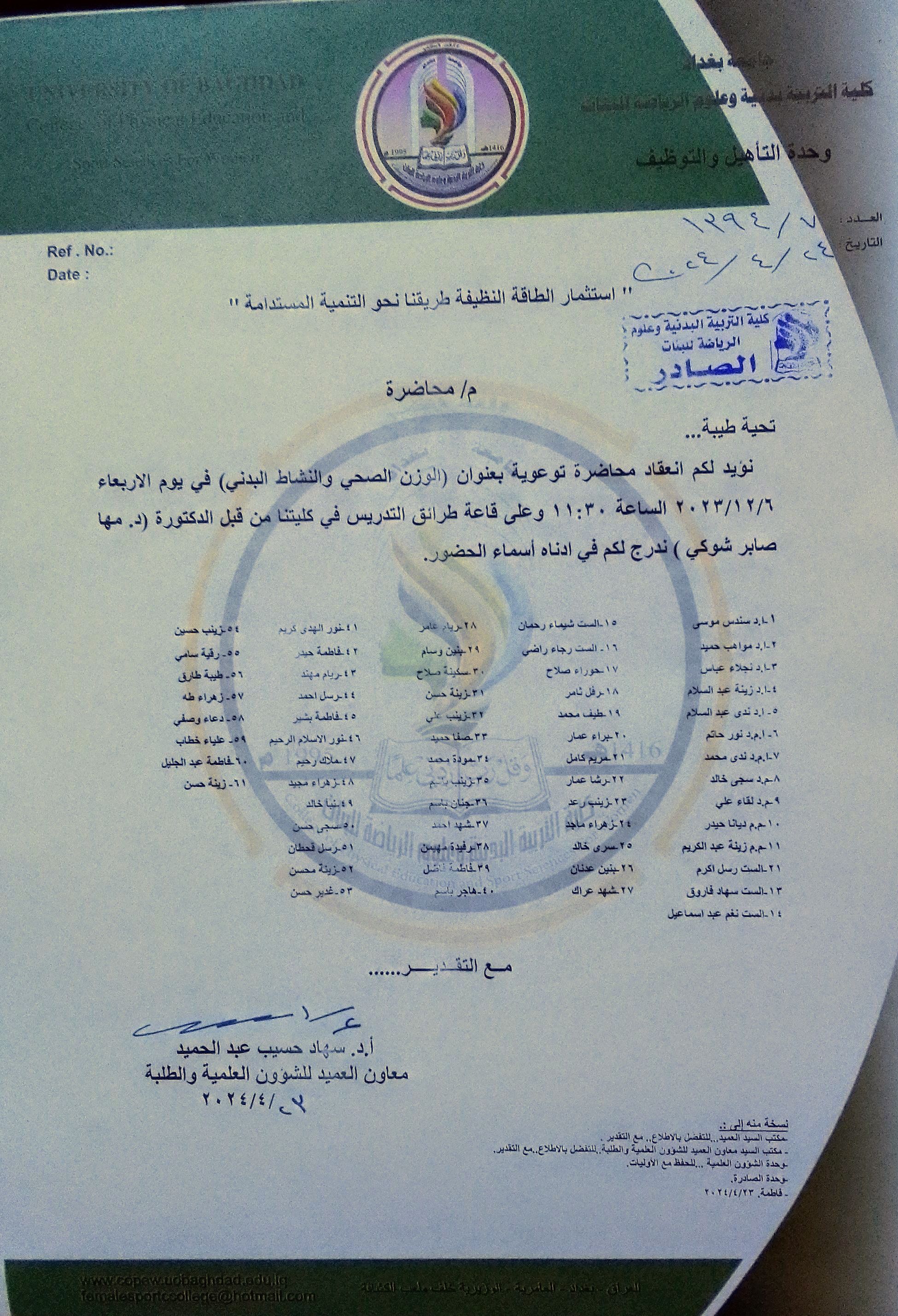 تم اقامة الندوة وبالتعاون والتنسيق مع د. مها صابر كوشي من وزارة الصحة/ معهد بحوث التغذية محاضرة توعوية لطالبات الدراسة الأولية ، وعلى قاعة طرائق التدريس وبحضور عدد من الطالبات والتدريسيات والموظفين بواقع 42 حاضر