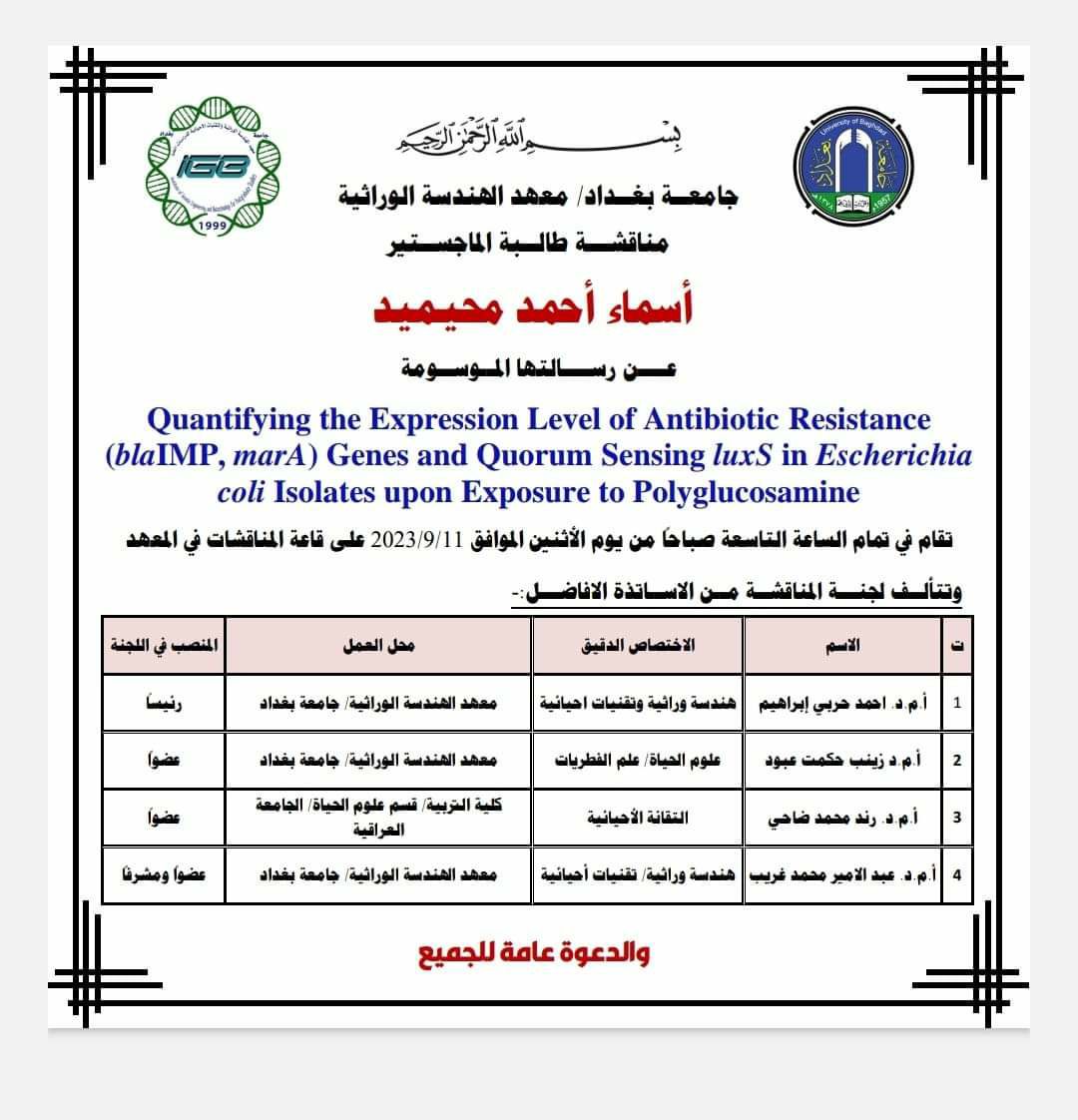 Quantifying the Expression Level of Antibiotic Resistance (bla IMP, marA) Genes and Quorum Sensing luxS in Escherichia coli Isolates upon Exposure to Polyglucosamineمناقشة