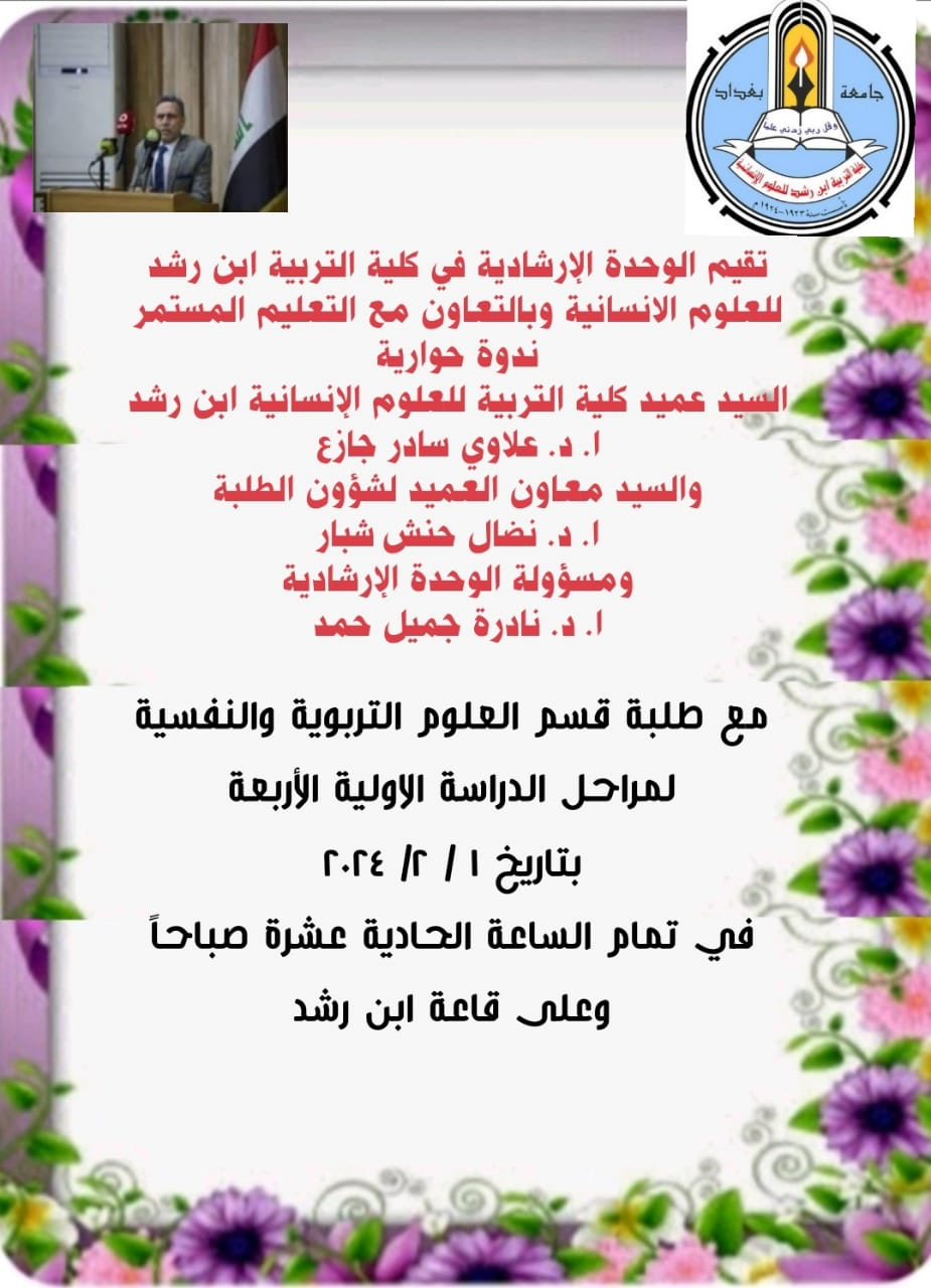 ندوة حوارية السيد عميد كلية التربية مع طلبة قسم العلوم التربوية و النفسية لمراحل الدراسة الاولية الاربعة