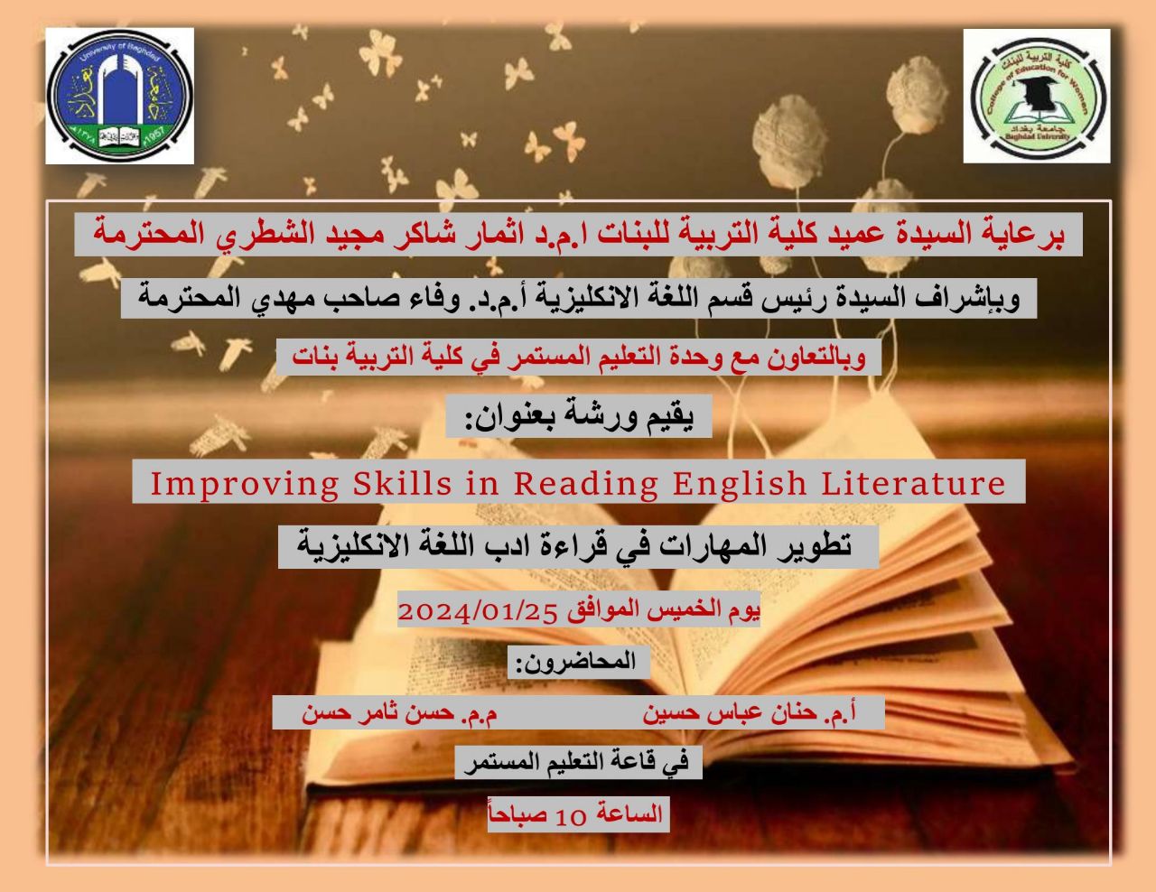 في قاعة التعليم المستمر ، يوم الخميس الموافق 2024-01-25 في تمام الساعة 11 صباحاً. كان هدف الورشة تحسين المهارات في كيفية تطوير مهارة القراءة في اللغة الانكليزية بصورة عامة، ومهارة قراءة الادب الانكليزي بصورة خاصة. وسلطت الضوء ايضاً على بعض النقاط المهمة التي تساعد القارىء بصورة عامة والطالب بصورة خاصة على ايجاد الطرق لفهم المعلومات عن طريق القراءة، و من ضمنها وضع الخطوط على المواضيع المهمة في العمل الادبي وتضليل الاحداث المهمة التي يعرضها الكاتب للقارىء.وتمحورت الورشة على شرح معنى الشخصيات والحبكة والتحليل والتشخيص والتجسيد والتشبيه واللغة المصورة التي يستخدمها الكاتب في العمل الادبي سواء كانت في الشعر او الرواية او المسرح .وحاضرت فيها كل من (أ.م.د. حنان عباس حسين) و (م.م حسن ثامر حسن). تم تحديد الأهداف التي خرجت من الورشة العلمية كما يلي: