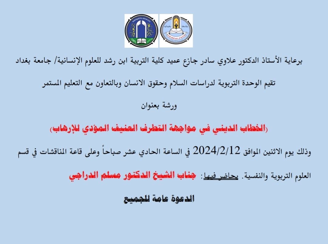تقيم الوحدة التربوية لدراسات السلام وحقوق الإنسان في كلية التربية ابن رشد للعلوم الانسانية وبالتعاون مع وحدة التعليم المستمر ورشة بعنوان (الخطاب الديني في مواجهة التطرف العنيف المؤدي للارهاب) وذلك يوم غد الاثنين الموافق ٢٠٢٤/٢/١٢ الساعة ١١ صباحاً وعلى قاعة المناقشات في قسم العلوم التربوية والنفسية.