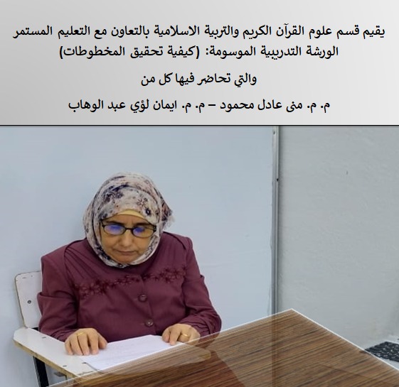 أقام قسم علوم القرآن والتربية الإسلامية بالتعاون مع وحدة التعليم المستمر في كلية التربية للبنات الورشة العلمية الموسومة( كيفية تحقيق المخطوطات )
