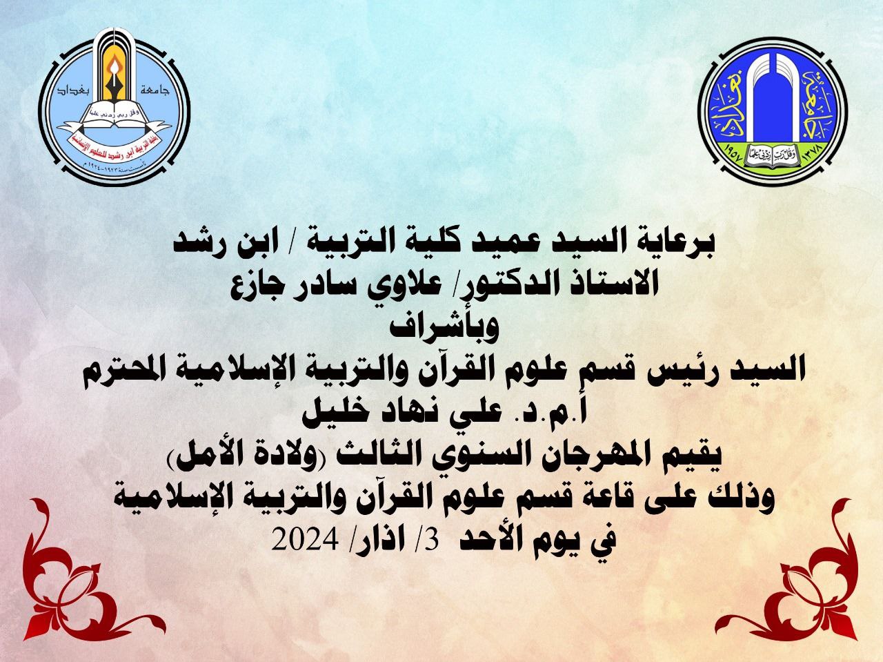 أقام قسم علوم القرآن محفل قراني بمناسبة الولادات الشعبانية افتتح المحفل بتلاوة قرآنية لقارئ العتبة الكاظمية أنور صباح تلتها كلمة من وحي المناسبة ل أ .م .د عقيل عبدالرزاق نعمان تعرض فيها إلى أهمية التمسك بعظماء الأمة ودور الإمام في عصر الغيبة ومن بعدها جائت مشاركة الشاعر عبد الخالق كرجي والذي القى شعرا بخصوص المناسبة ثم شارك المنشد عبد الله الساعدي واختتم المحفل بتلاوة قرانية لطالب الكلية احمد سهر الزبيدي وقد ادار المحفل أ.م.د وسام مجيد حسن
