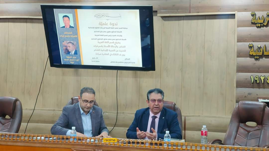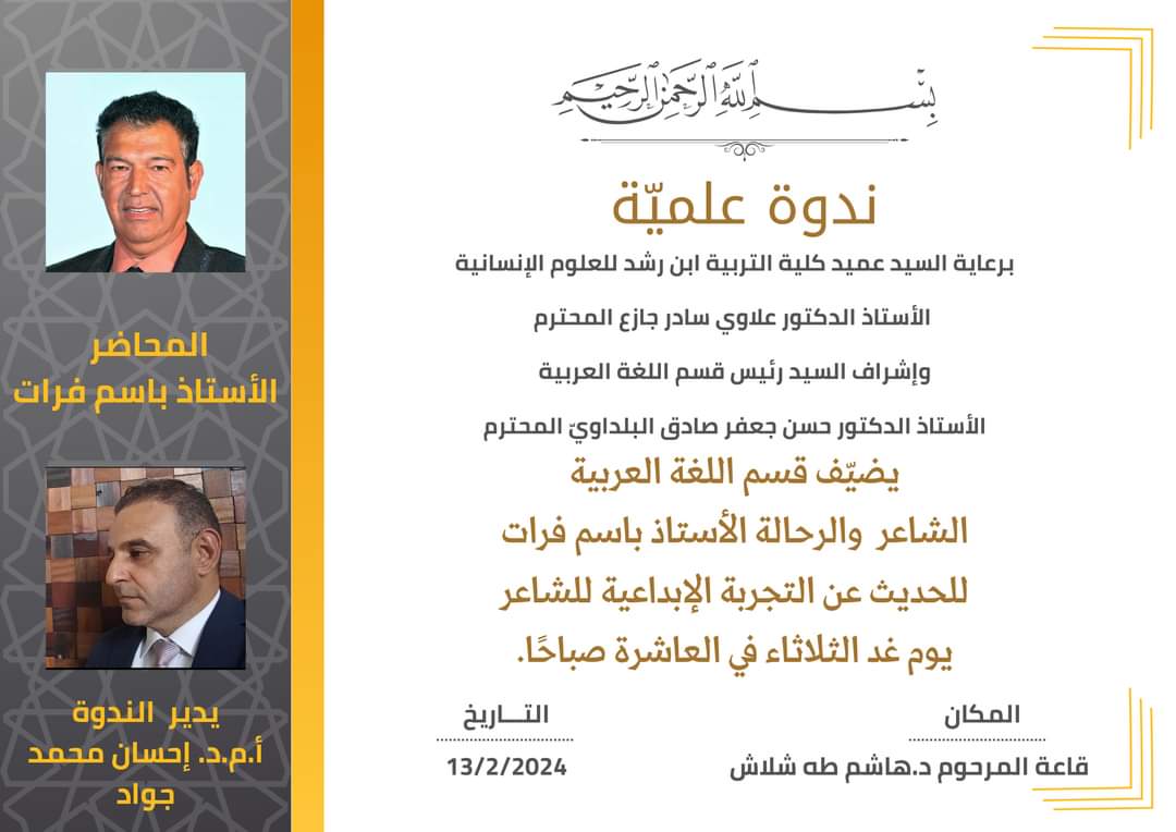 في حوارية عن التجربة الإبداعية لباسم فرات، يضيف قسم اللغة العربية في كلية التربية ابن رشد للعلوم الإنسانية الشاعر والرحالة باسم فرات للحديث عن تجربته الشعرية الإبداعيّة. يوم غد الثلاثاء على قاعة المرحوم الأستاذ الدكتور هاشم طه شلاش.