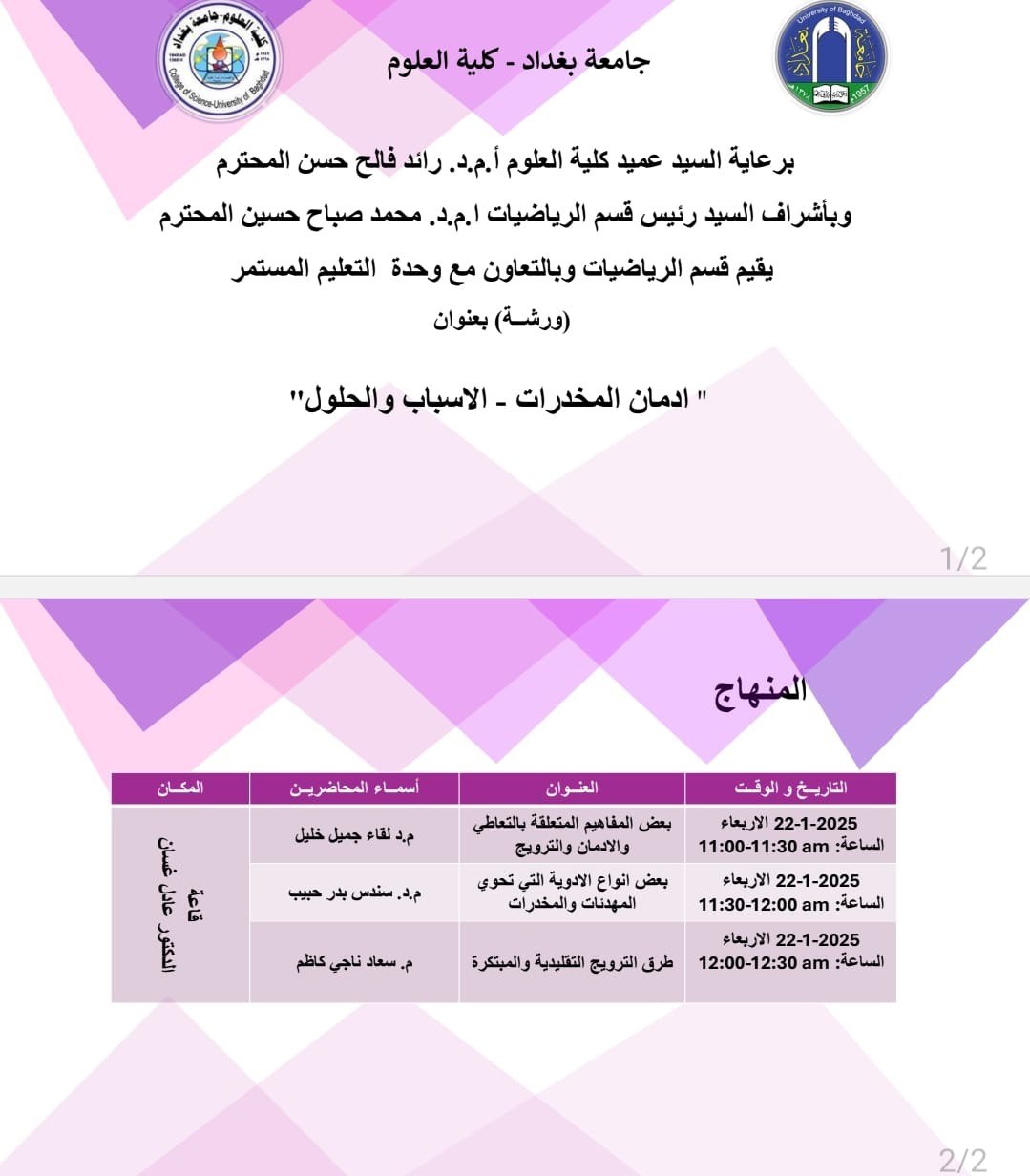 1. التعريف باالدمان.• 2. التعرف على مراحل االدمان.• 3. التمييز بين االدمان والتعاطي.• 4. مناقشة اهم عوامل الخطر.• 5. التعرف على بعض المضاعف