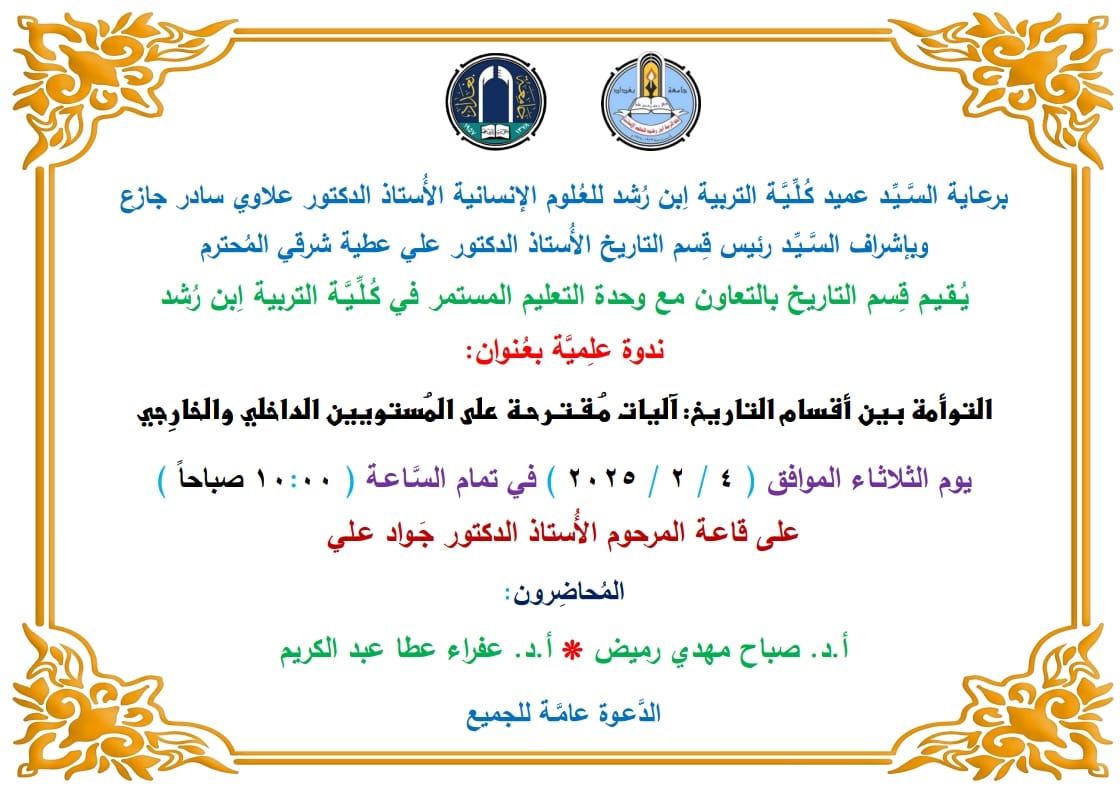 تضمنت الندوة محورين ، الاول التعريف بمصطلح التوأمة واليات التعاون بين اقسام التاريخ في الجامعات العراقية، وتضمن المحور الثاني، التوأمة واليات التعاون مع الاقسام في الجامعات العربية والاقليمية والدولية، واكدت طروحات الندوة على اهمية التعاون على المستوى العلمي ، والمقررات الدراسية والشؤون الطلابية كما وتم التركيز على ان مثل هذه الندوات ستكون خطوات مهمة في تحقيق اهداف الاعتماد البرامجي لكليات التربية في العراق
