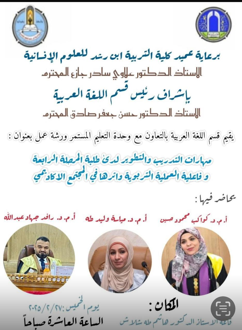 مهارات التدريب والتطوير لدى طلبة المرحلة الرابعة وفاعلية العملية التربوية واثرها في المحتمع الاكاديمي**Training and Development Skills of Fourth-Year Students, the Effectiveness of the Educational Process, and Its Impact on the Academic Community**ورشة عمل