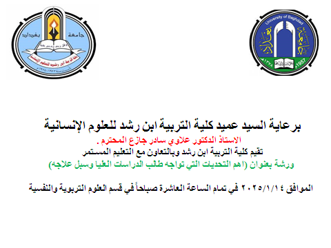 يقيم قسم الغلوم التربوي والنفسي ورشة علمية بعنوان اهم التحديات والمشكلات التي تواجه طلبة الدراسات العليا وكيفية علاجهاولاهمية الورشة الحالية أهم المشاكل والتحديات التي تواجه طلبة الدراسات العليا للسجل السريال في مرحلة الحرجة من التعرف على الصعوبات التي تواجهها تعلم كيفية علاجها لتعلم حلول دقيقة وحساسة لا بد من التمكن منها وذلك بسبب ان هذه الجهة مهمة لاعدادهم ويمكن ويحاضر فيها كل من ا. فاتن خيري محمد وا.د سعدون نجم سلمان وا.د هشام محمد خلف