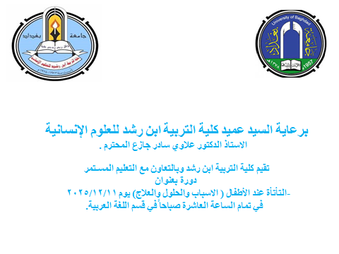 - ويوصي المحاضرون كذلك بأهمية إقامة ورش تدريبية لأعضاء الهيأة التدريسية والطلبة في الجامعات للتوعية بالسبل الصحيحة لتحسين حالة الاطفال الذين يعانون من الاضطرابات النطقية وكيفية التعامل الصحيح معهم