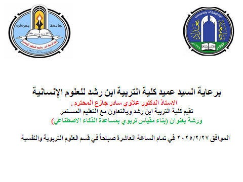 يقيم قسم العلوم التربوية والنفسية ورشة بعنوان بناء مقياس تربوي بمساعدة الذكاء الاصطناعي تهدف الورشة الحالية إلى تعليم طلاب قسم العلوم التربوية والنفسية كيفية بناء مقياس في أي تخصص وبمساعدة الذكاء الاصطناعي في كيفية بناءالمقاييس النفسية والتربوية في جميع المجالات وبنفس الخظوات الطريقة الاعتيادية وعلى اسس علمية صحيحة وبوقت اقل وحاضر بها كل من ا.م.د زيان يحيى بلال وم.م امنة رعد وم.الاء محمد حسين