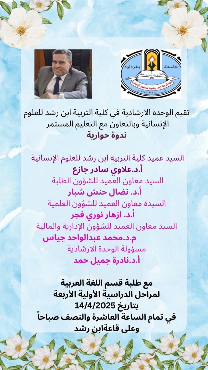 ندوة السيد العميد مع طلبة قسم اللغة العربية للمراحل كافة The Dean's seminar with students of the Arabic Language Department at all levelsندوة