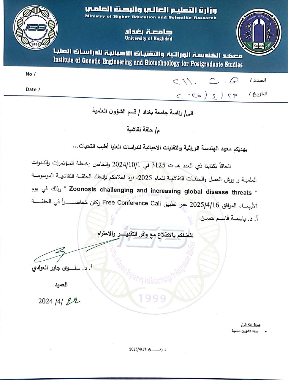 through Free Conference Call (Institute of Genetic Engineering and Biotechnology for Postgraduate Studies)