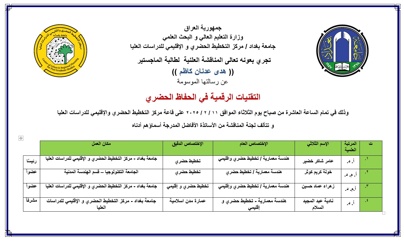 The thesis aimed to identify the digital technologies involved in urban conservation and to verify the presence and use of these technologies in conservation areas in Baghdad. The student concluded that digital technologies used in urban conservation are employed in documentation, protection, and tourism. She further concluded that digital technologies represent important tools for digitizing and documenting architectural and urban heritage, enabling the creation of a database that serves as the foundation for heritage protection and tourism, in addition to developing heritage facades through images and 3D models used in augmented and virtual reality.