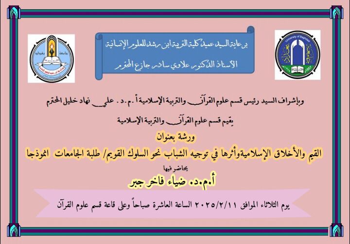 أقام قسم علوم القرآن والتربية الإسلامية ورشة بعنوان ( القيم والأخلاق الإسلامية وأثرها في توجيه الشباب نحو السلوك القويم (طلبة الجامعات أنموذجا) ) يوم الثلاثاء الموافق 11 /2/2025م ، حاضر فيها أ.م.د. ضياء فاخر جبر ، أ.د. محمد قاسم لعيبي ، وتتلخص الورشة بما يلي :