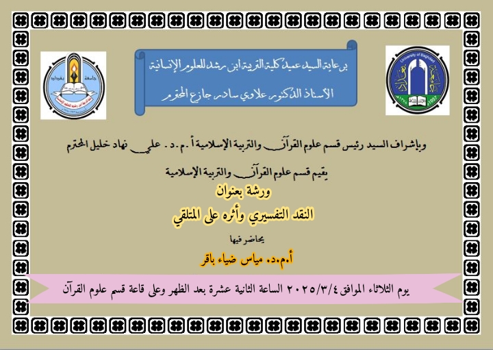 أقام قسم علوم القرآن والتربية الإسلامية ورشة بعنوان ( النقد التفسيري وأثره على المتلقي ) يوم الثلاثاء الموافق 4 /2025/3م ، حاضر فيها أ.م.د. مياس ضياء باقر ، وتتلخص الورشة بما يلي