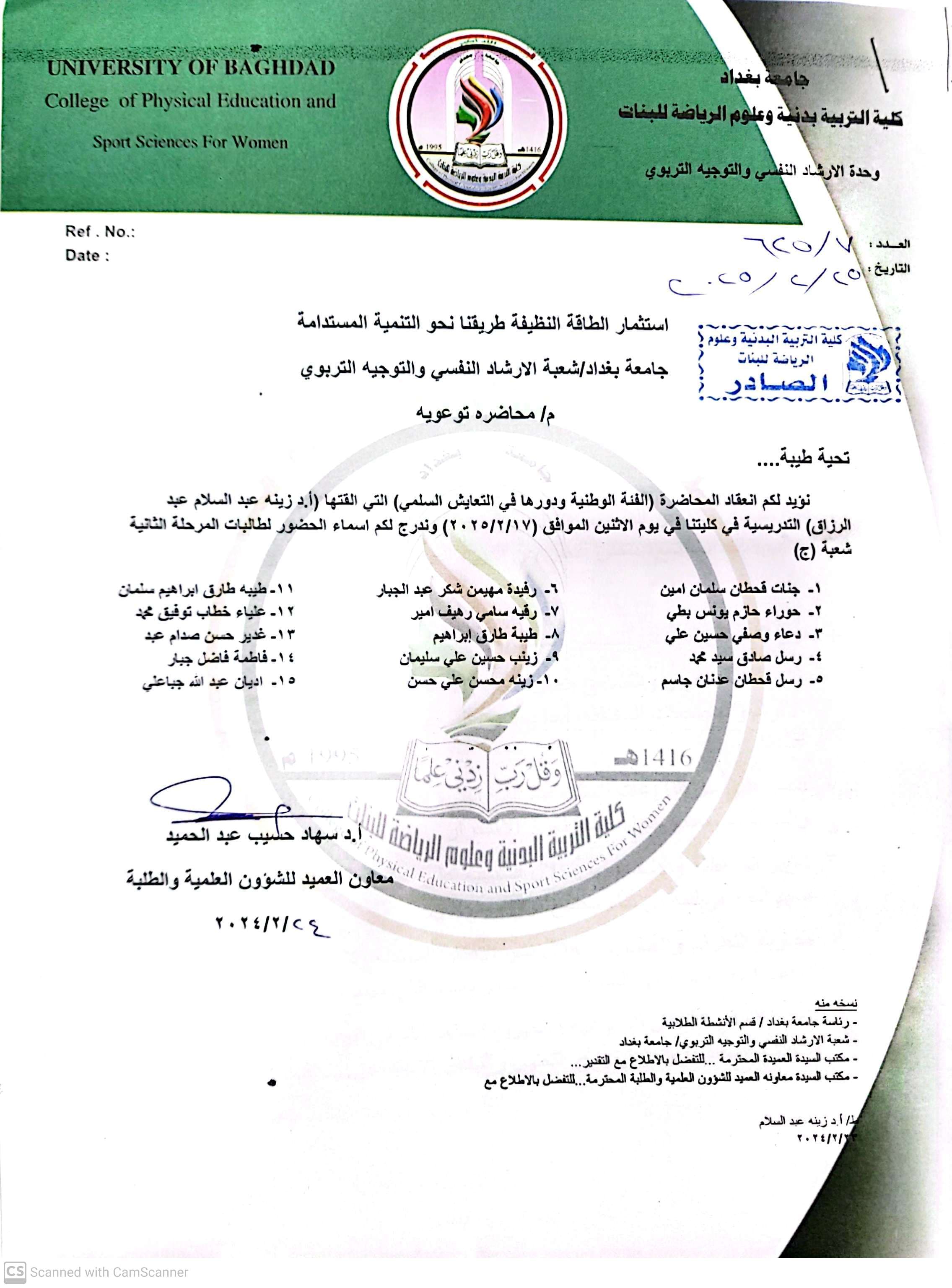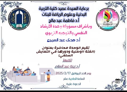 تم اقامة المحاضرة في القاعة النظرية لكلية التربية البدنية وعلوم الرياضة للبنات بحضورعدد من الطالبات بواقع