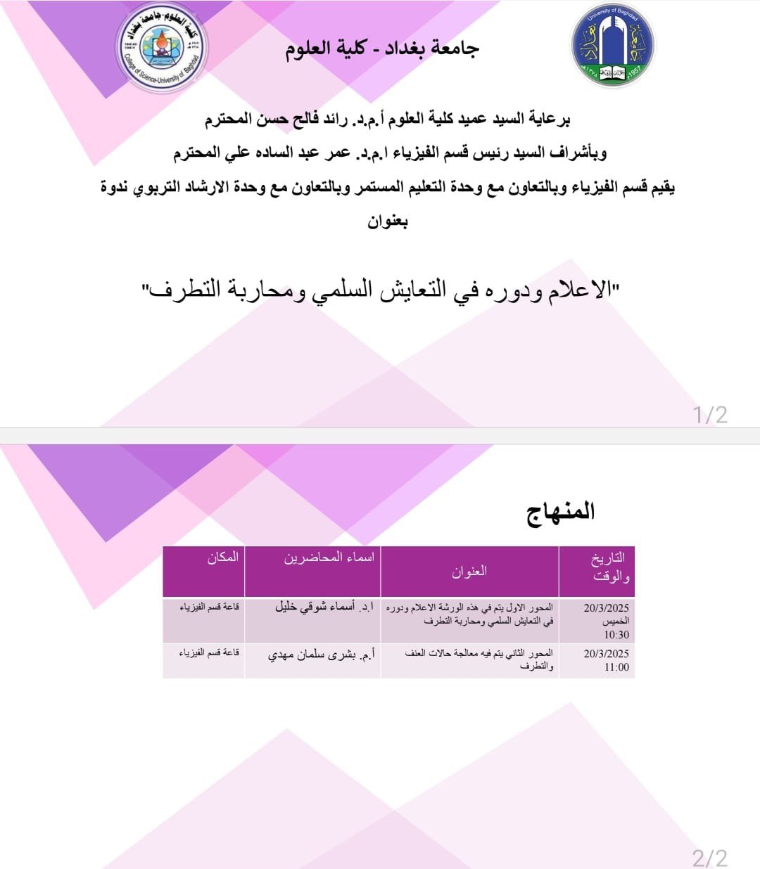 • توعية الطلبة بأهمية التعايش السلمي بين افراد المجتمع كافة وأيضا بين الطلبة وقبول الاخر .