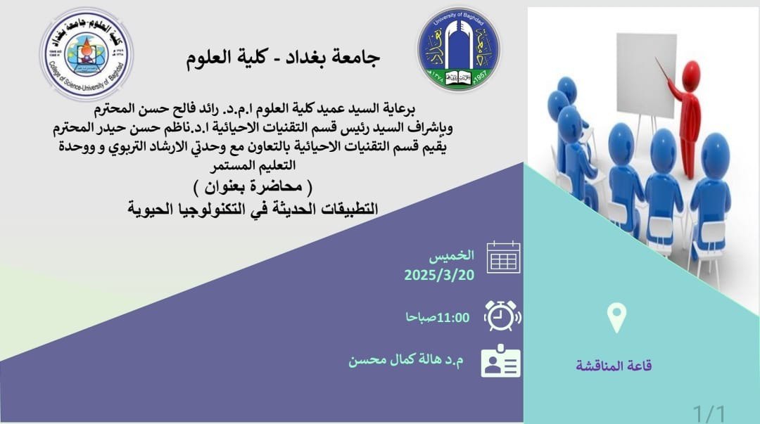 التعريف بالتكنولوجيا الحيوية ومجالاتها (الطب، الزراعة، البيئة، الصناعة).عرض التطورات الحديثه العلاج الجيني (CRISPR)، الهندسة الوراثية، والوقود الحيوي.مناقشه التحديات والاخلاقيات المتعلقة باستخدام هذه التقنيات.تشجيع الابتكار في هذا المجال.