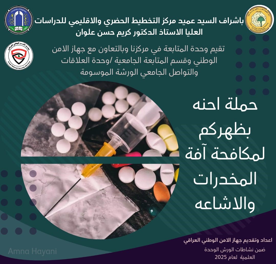 A workshop was held by the Center of Urban and Regional Planning for Postgraduate Studies in cooperation with the Iraqi National Security Service and the University Follow-up Department/University Communication and Relations Unit.