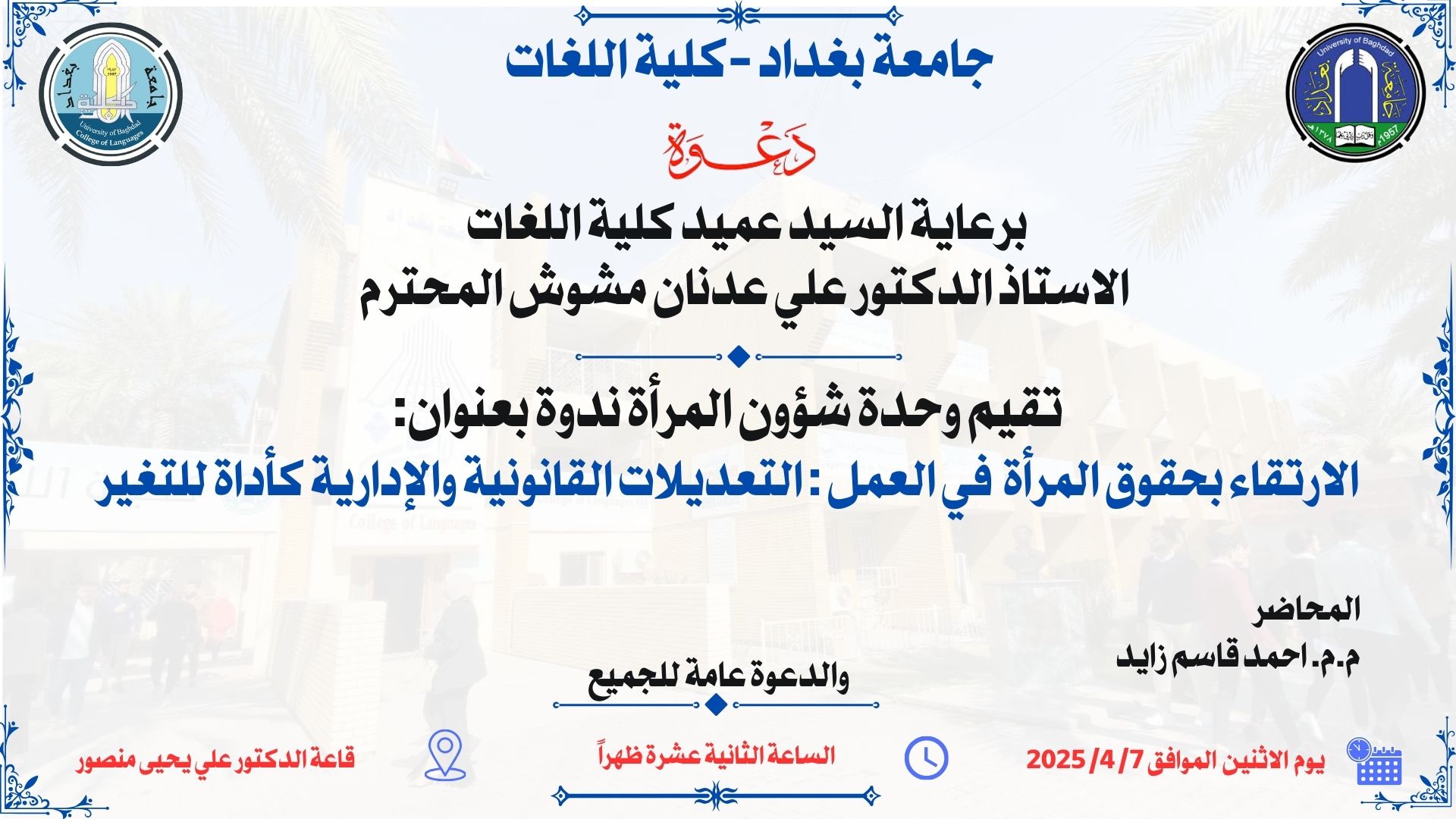 يهدف هذا النشاط إلى مناقشة التعديلات القانونية والإدارية التي تعزز حقوق المرأة في سوق العمل العراقي، وذلك من خلال تحسين القوانين والتشريعات لضمان المساواة، توفير بيئة عمل آمنة، وتقليل التمييز الوظيفي. كما يتناول أهمية الإصلاحات الإدارية كأداة لتحقيق تغيير إيجابي ومستدام يمكن المرأة من المشاركة الفاعلة في التنمية الاقتصادية والاجتماعية