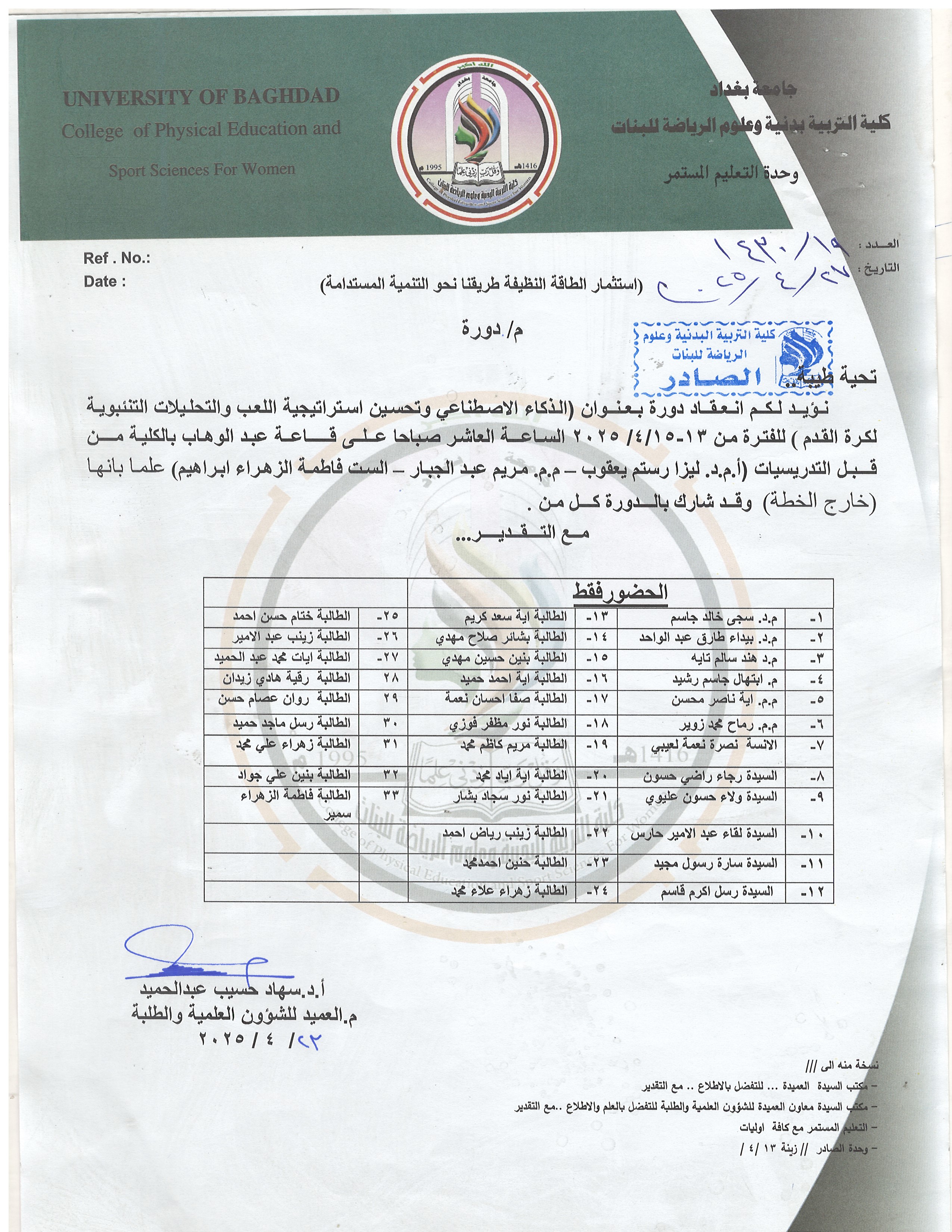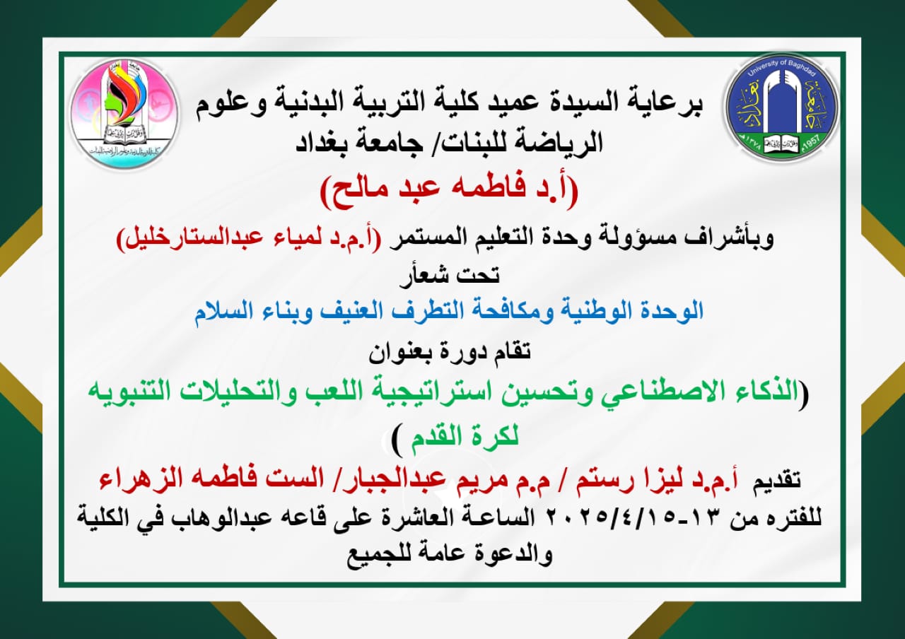 تم اقامة دورة بعنوان (الذكاء الاصطناعي وتحسين استراتيجية اللعب والتحليلات التنبؤية بكرة القدم) وعلى قاعة اكرم فهمي وبحضو ر عدد من تدريسيات والطالبات وبواقع 33 حاضرا