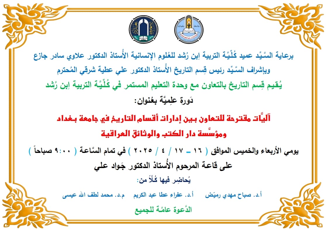 تدور أحداث الدورة حول آلية التعاون بين اقسام التاريخ في جامعة بغداد ودار الكتب والوثائق العراقية التابعة لوزارة الثقافة العراقية وقد ركز الأساتذة المحاضرين خلفية تأسيس دار الكتب والوثائق منذ العام 1920 وكيف تحولت من مكتبه عامة بعد اندماجها مع دار الوثائق الوطنية في العام 1987 لتتحول إلى دار الكتب والوثائق الوطنية او مايعرف بالمكتبة الوطنية وأقسامها والشعب التي يضمها الدار كما تناول المحاضرون كيف يتم التعاون مع اقسام التاريخ من خلال إقامة الدورات والورش بينهما أو إقامة الزيارات لطلبة لمراحل الأخيرة للاستفادة من تعريفهم كيفية استخدام الكتب والوثائق والبحث عنها كما يتم زيارة طلبة المراحل الأولى في مادة منهج البحث لتعليم الطلبة كيفية استخراج الكتب والوثائق وكيفية استخدامها وانتهت الدورة بأداء الامتحان الورقي بتوزيع الاسئلة على السادة الحضور وتم استلام الاجابات بعد انتهاء الوقت المحدد