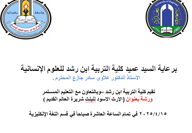 للعلوم الإنسانية بجامعة بغداد ورشة علمية بعنوان “الارث الأسود لليلث شريرة العالم القديم: مراجعة نسوية لأسطورة المرأة المدمرة في الادب الإنكليزي”, حاضر فيها الدكتورة صباح عطا الله ضيائي, وحضرها عدد من أساتذة الكلية وطلبة الماجستير في القسم.