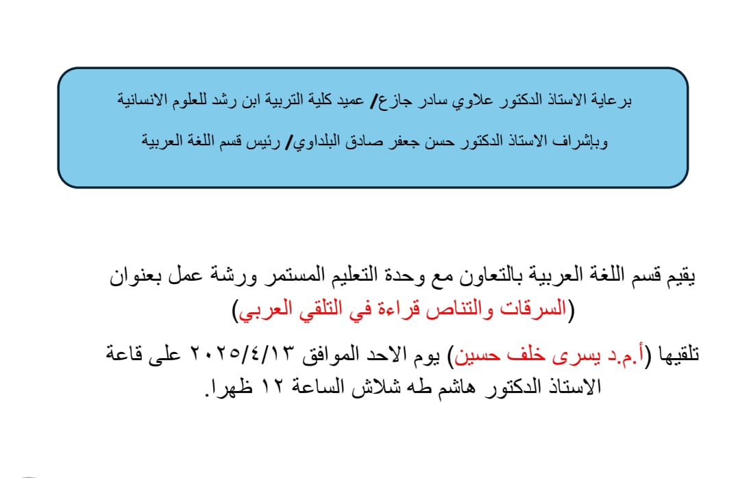 أقام قسم اللغة العربية في كلية التربية ابن رشد للعلوم الإنسانية بجامعة بغداد ورشة علمية بعنوان “السرقات والتناص: قراءة في التلقي العربي” حاضر فيها الدكتورة يسرى خلف حسين, وحضرها عدد من تدريسي وطلبة الكلية. قسمت الورشة الى عدة محاور: تضمن الأول منها مفهوم التناص, فيما اختص المحور الثاني ببيان مفهوم السرقة الأدبية, وجاء المحور الثالث حول أوجه التشابه بين التناص والسرقات الأدبي, والمحور الرابع كان حول أوجه الاختلاف بين التناص والسرقات الأدبية, وتضمن المحور الأخير الموقف النقدي العربي من الظاهرتين. وهدفت الورشة الى فهم الفرق بين التناص والسرقة الأدبية, إضافة الى التعمق في مفاهيم النقد الأدبي العربي والغربي واستكشاف التأصيل النظري لـ التناص كما طرحه النقاد الغربيون مثل جوليا كريستيفا وميخائيل باختين وفهم كيف تناول النقاد العرب القدامى مثل الجرجاني وابن رشيق موضوع السرقات الأدبية في سياقهم الثقافي والنقدي, الى جانب تعزيز التفكير النقدي بين المشاركين تشجيعهم على استخدام أدوات نقدية لفحص النصوص الأدبية الحديثة والقديمة وتطوير قدرة المشاركين على النقد والتمييز بين الإبداع والنسخ في الكتابات الأدبية. وفي ختام الورشة اوصت حسين بضرورة تشجيع الباحثين والكتّاب على التفاعل النقدي مع النصوص, إضافة الى التأكيد على ضرورة التفريق بين التناص والسرقة الأدبية, و إعادة تقييم السرقات الأدبية في السياق النقدي الحديث, والى جانب ذلك ضرورة إبراز أهمية التفاعل بين التراث الأدبي والنقد المعاصر, و التأكيد على التفاعل الإبداعي بين الأجيال الأدبية.