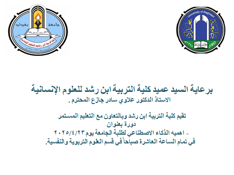 برعاية عميد كلية التربية ابن رشد للعلوم الانسانية بجامعة بغداد الاستاذ الدكتور علاوي سادر جازع ,اقام قسم العلوم التربوية والنفسية ورشة عمل بعنوان (أهمية الذكاء الاصطناعي لطلبة الجامعة), حاضر فيها كل من الاستاذ الدكتور صبا حامد حسين ,والاستاذ المساعد الدكتور هند صبيح رحيم ,والاستاذ المساعد الدكتور زيان يحيى بلال.