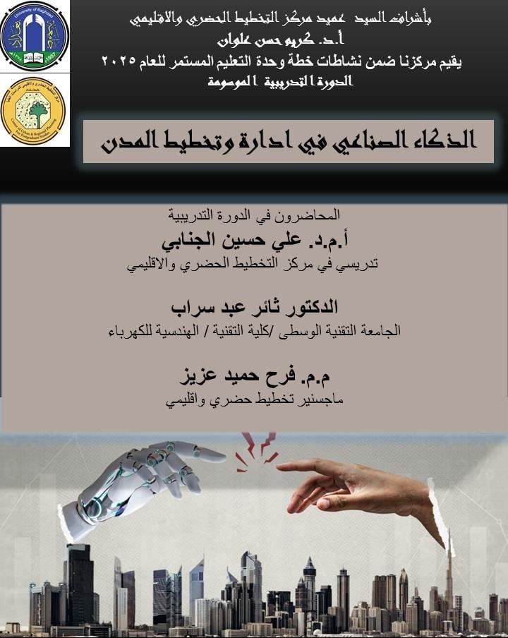 A training workshop will be presented by Assistant Professor Dr. Ali Hussein Al-Janabi, Dr. Thaer Abdul Sarab (Lecturer at the Middle Technical University/College of Technology/Electrical Engineering), and Assistant Lecturer Farah Hamid Aziz (Master's in Urban and Regional Planning).