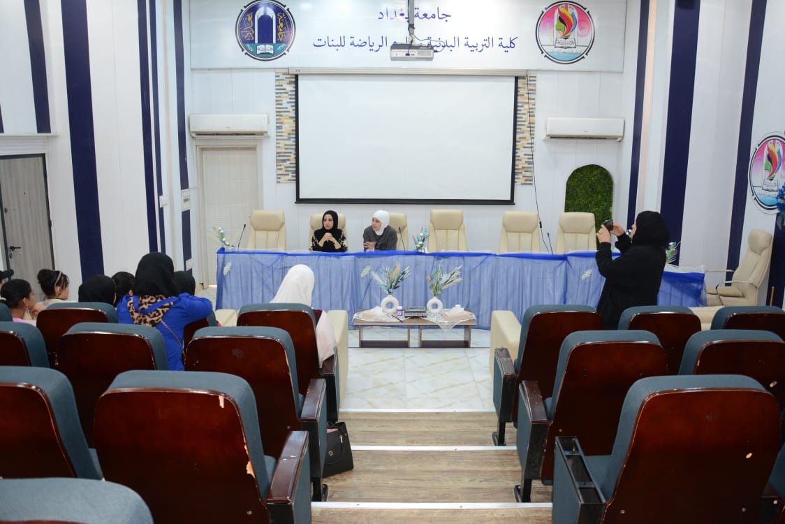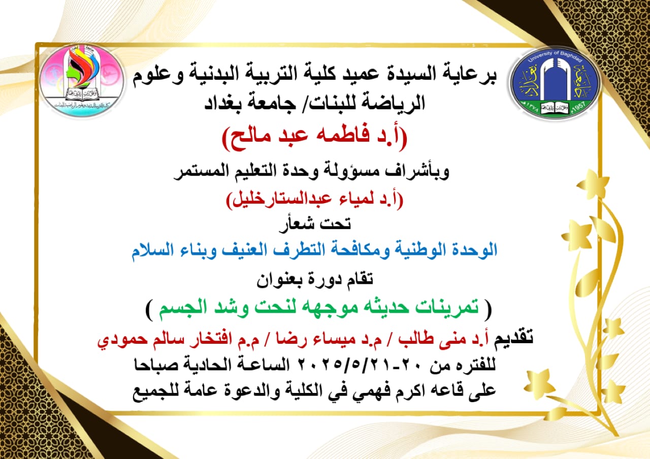 تم اقامة دورة بعنوان (تمرينات حديثة موجهة لنحت شد الجسم ) وعلى قاعة اكرم فهمي بحضور عددمن التدريسيات وموظفات والطالبات بواقع 20 حاضرا