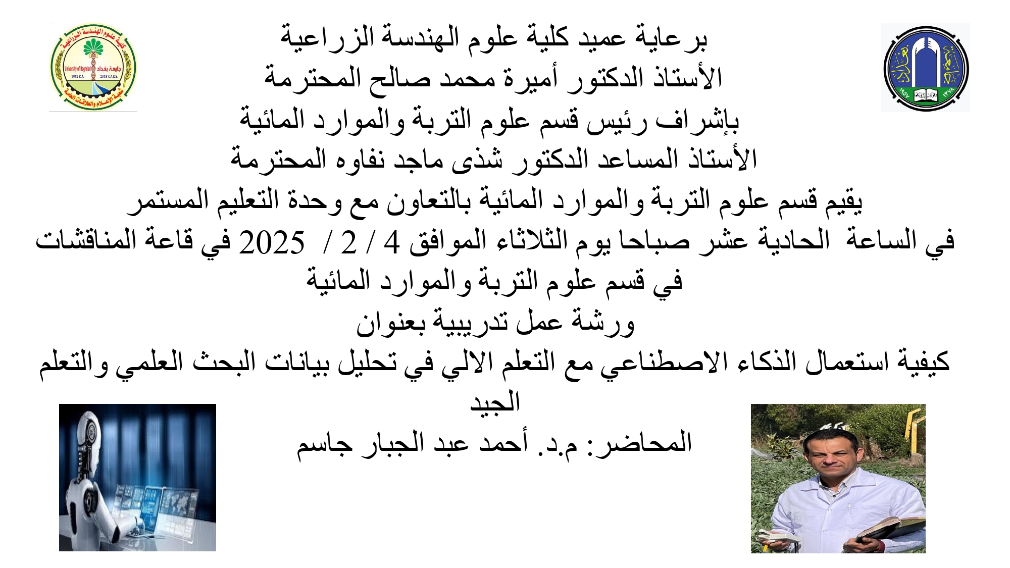 The Department of Soil Sciences and Water Resources, in cooperation with the Continuing Education Unit, held a workshop on artificial intelligence in scientific research applications in agricultural fields. The event was organized under the patronage of the Dean of the College, Professor Dr. Amira Mohammed Saleh, and under the supervision of the Head of the Department, Dr. Shatha Majid Nafawa. The scientific content was presented by Dr. Ahmed Abdul Jabbar Jassim.