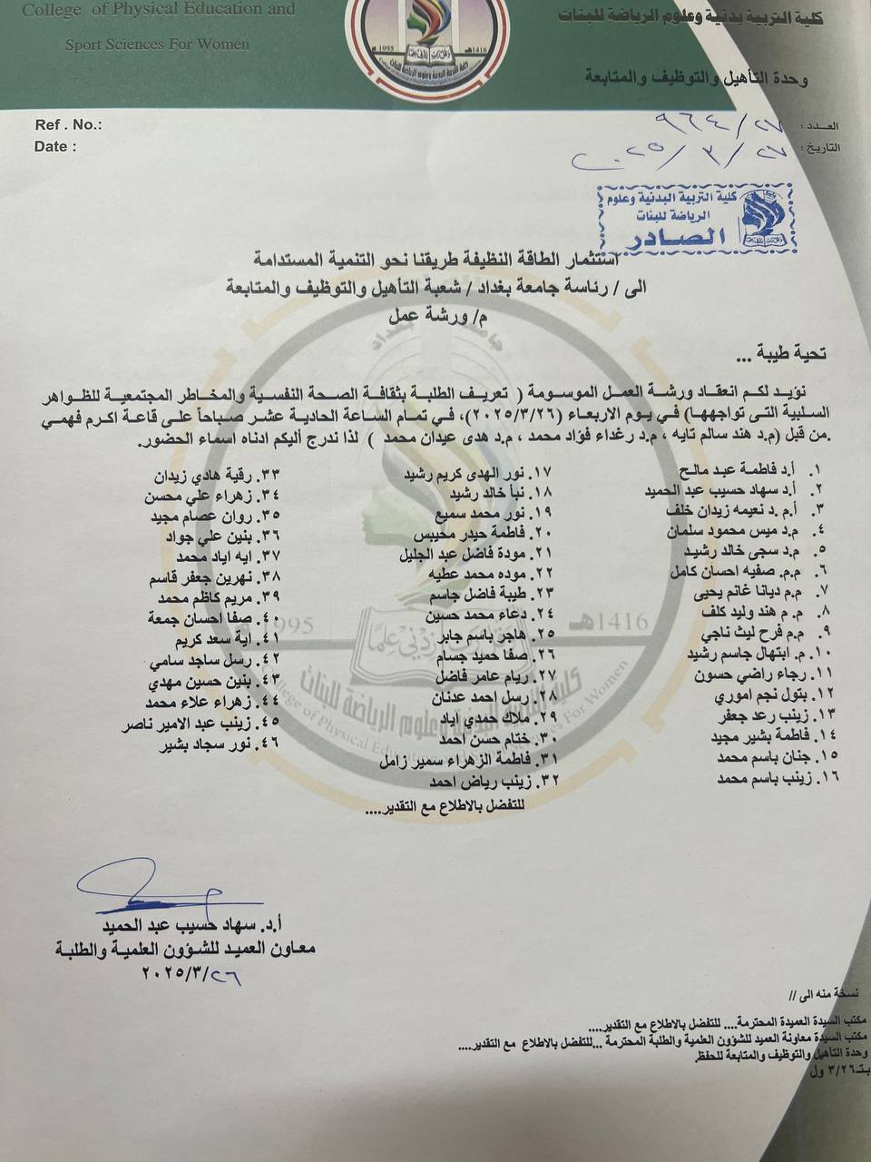 تم اقامة الورشة على قاعة اكرم فهمي حيث بلغ عدد الحضور 46 مابين تدريسيات وطالبات