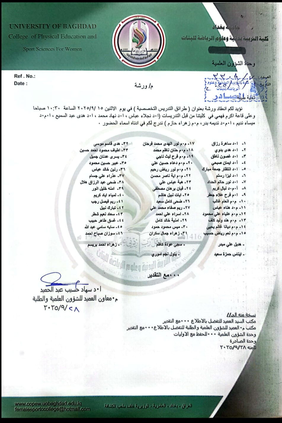 وتوصي الورشة بضرورة تنويع طرائق التدريس بما ينسجم مع مخرجات التعلم المستهدفة وعدم الاقتصار على الطريقة التقليدية، وتشجيع التدريسيين على إدماج استراتيجيات التعلم النشط والتعلم التعاوني داخل الصفوف الدراسية، مع توفير دورات تدريبية مستمرة لتمكين أعضاء الهيئة التدريسية من مواكبة المستجدات في هذا المجال. كما تؤكد على أهمية إدخال الوسائل التعليمية والتقنيات الرقمية كأدوات أساسية في العملية التعليمية والتركيز على الطالب بوصفه محور العملية التعليمية وإعطائه فرصاً أوسع للتفاعل والمشاركة، فضلاً عن اعتماد آليات تقييم مستمرة لقياس مدى كفاءة الطريقة التدريسية في تحقيق أهداف التعلم وتفعيل التعاون بين الأقسام العلمية والكليات لتبادل الخبرات التدريسية