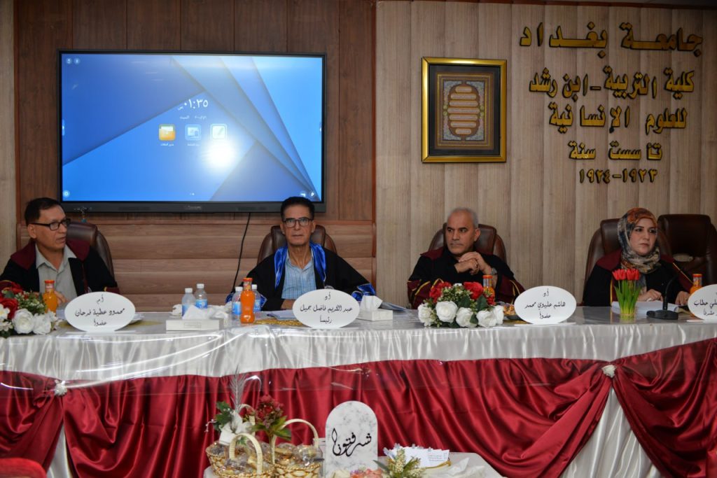 شهدت كلية التربية ابن رشد للعلوم الانسانية بجامعة بغداد مناقشة رسالة الماجستير بعنوان (استراتيجيات الجدال في الخطابات الرئاسية : دراسة تداولية اسلوبية) للباحثة من قسم اللغة الانكليزية (انتصار عبد الرضا علوان) تخصص لغة, وضمت لجنة المناقشة كل من الاستاذ الدكتور عبد الكريم فاضل رئيسا ,والاستاذ المساعد الدكتور هدى عبد علي عضوا ومشرفا , والاستاذ المدرس محمود عطية فرحان عضوا, والاستاذ الدكتور هاشم عليوي محمد عضوا خارجيا من جامعة واسط – كلية التربية للعلوم الانسانية.