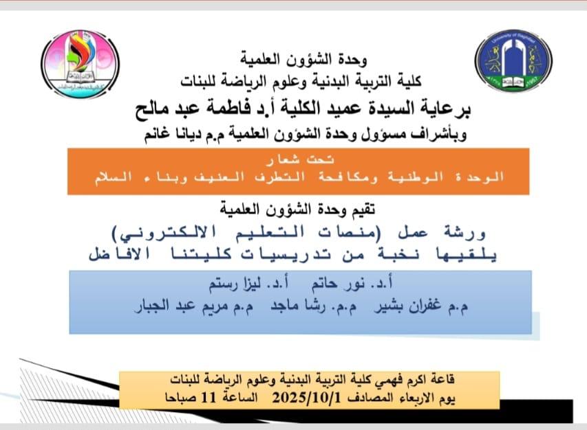 أوصت الورشة بضرورة العمل على تطوير البنية التحتية الرقمية بما يضمن استقرار خدمات الإنترنت وسهولة الوصول إلى المنصات التعليمية. كما أكدت على أهمية تدريب الكوادر التدريسية والطلبة على استخدام التقنيات الحديثة بفاعلية، بما يعزز من جودة العملية التعليمية. وشددت التوصيات على ضرورة اعتماد استراتيجيات تفاعلية داخل المنصات الإلكترونية لزيادة دافعية الطلبة وتحفيزهم على المشاركة. كذلك أوصت بتبني سياسات داعمة للتعليم المدمج تجمع بين التعليم الحضوري والإلكتروني، بما يحقق التوازن بين التفاعل المباشر والمرونة الرقمية. وأخيرًا، أوصت الورشة بتشجيع البحوث والدراسات التي تقيّم أثر استخدام المنصات الإلكترونية على مخرجات التعليم وتطويرها بما يتلاءم مع الاحتياجات المحلية