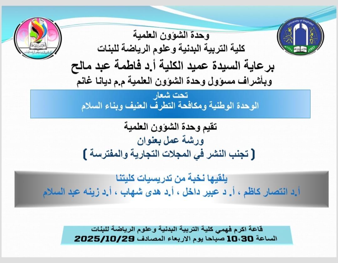 تهدف الورشة لى نشر الوعي بين الباحثين والتدريسيين حول مخاطر النشر في المجلات التجارية المفترسة التي تفتقر إلى التحكيم العلمي الرصين، والتعريف بآلية التحقق من مصداقية المجلات العلمية قبل النشر. كما تسعى إلى تعزيز ثقافة النشر الأكاديمي المسؤول والالتزام بمعايير الجودة والشفافية في البحث العلمي، بما يضمن المحافظة على سمعة الباحث والمؤسسة الأكاديمية.