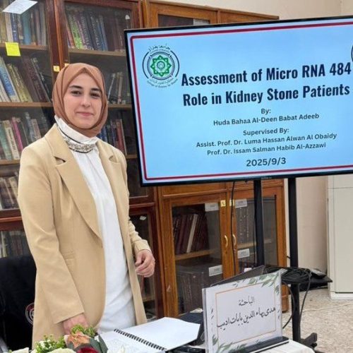 هدفت الرسالة إلى تسليط الضوء على الدور التنظيمي المحتمل لـ miR‑٤٨٤ في تعديل التعبير الجيني ل VDR و دوره في تكوين حصوات الكلى CaOx. شملت الدراسة ٩٠ مشاركًا، توزعوا على ٤٠ من الأصحاء (مجموعة السيطرة)، ٥٠ مريضًا بحصى الكلى CaOx، بالإضافة الى تقييم الأختبارات كيميائية حيوية من ضمنها مستوى فيتامين د و الكالسيوم في مصل الدم و تأثيرها على تنظيم تكوين حصى الكلى CaOx.