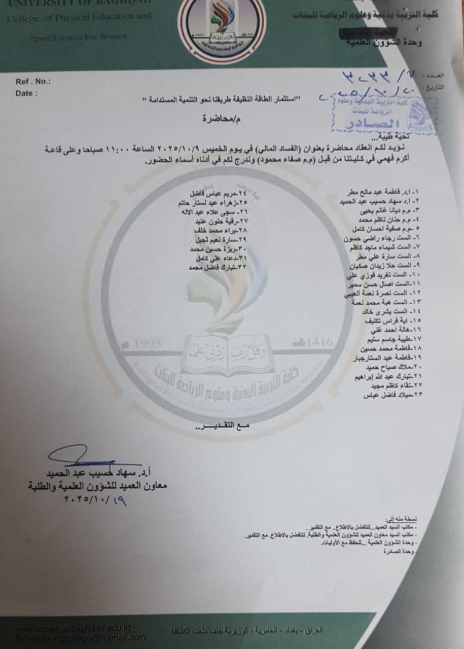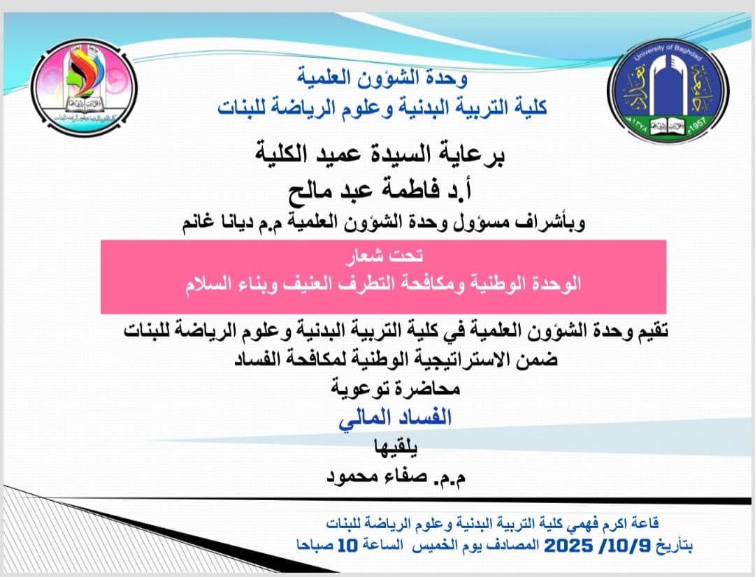تقيم وحدة الشؤون العلمية وضمن استراتيجية مكافحة الفساد محاضرة توعوية بعنوان الفساد المالي