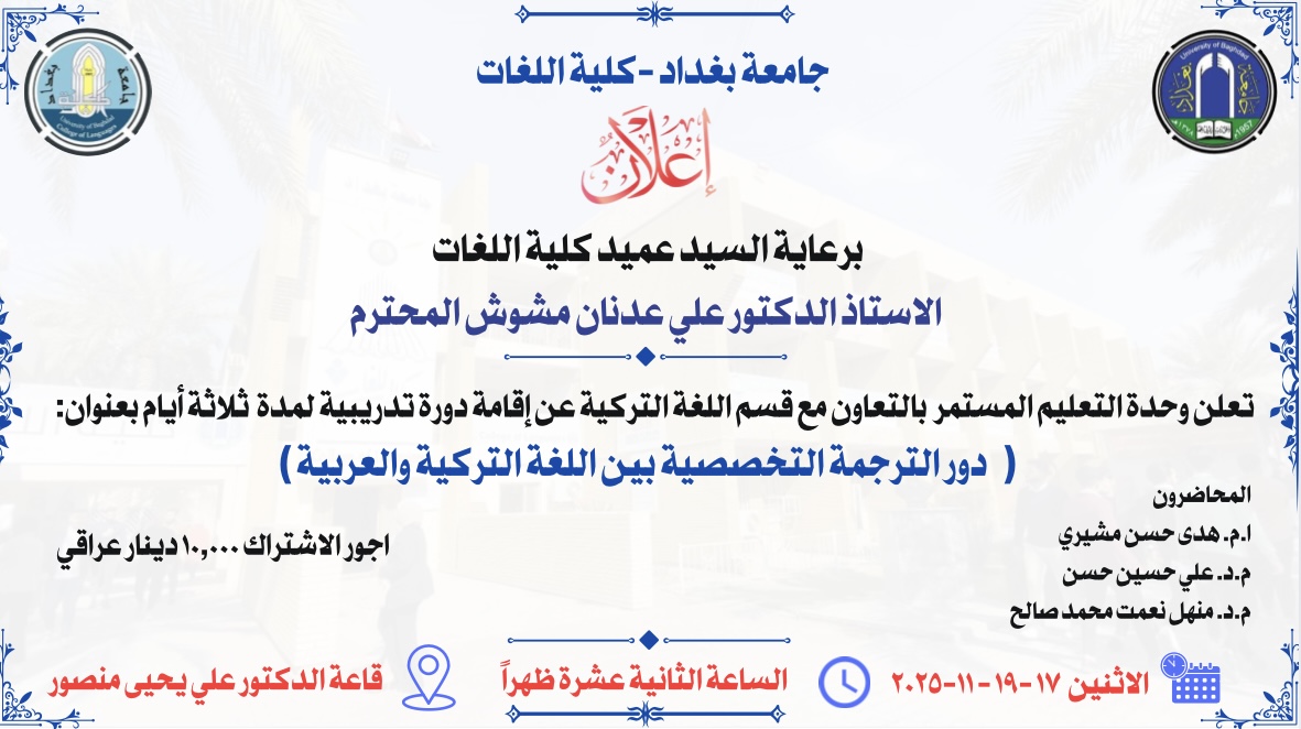 تُقدَّم الدورة بإشراف نخبة من الأساتذة المختصين في مجال الترجمة واللغة التركية، وتُعد فرصة لتعزيز الكفاءة اللغوية وتبادل الخبرات بين المتخصصين والمهتمين بهذا المجال.