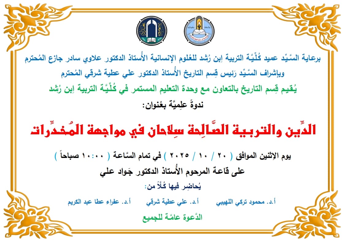 ندوة بعنوان : الدين والتربية الصالحة سلاحان في مواجهة المخدرات . ◼️نظّم قسم التاريخ في كلية التربية ابن رشد للعلوم الإنسانية /جامعة بغداد، يوم الأثنين الموافق 20تشرين الأول 2025، ندوة بعنوان :[الدين والتربية الصالحة سلاحان في مواجهة المخدرات] قدمها الاساتذة الافاضل: أ.د محمود تركي فارس اللهيبي أ.د علي عطية شرقي الكعبي أ.د عفراء عطا عبدالكريم الريس بحضور عدد من الأساتذة وطلبة الكلية.