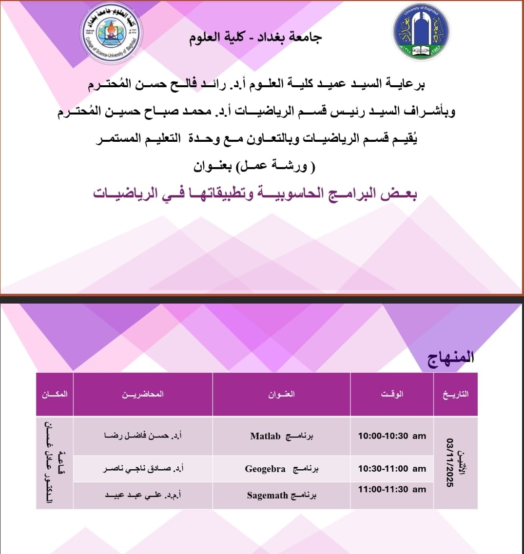 في هذه الورشة سوف نقدم نبذة تعريفية عن بعض البرامج المستعملة في الرياضيات وكيفية استخدامها في حل بعض المسائل الرياضية منها برنامج ماتلاب وهو برنامج مهم وكثير الاستعمال في الرياضيات التطبيقية ورنامج جيوجبرا هو تطبيق تفاعلي في الهندسة والجبر والإحصاء وحساب التفاضل والتكامل. جيوجبرا متوفر على منصات متعددة، مع تطبيقات لأجهزة الكمبيوتر والأجهزة اللوحية. وبرنامج سكماث هو برنامج مهم في الرياضيات يتميز بخصائص تغطي العديد من الجوانب الرياضية بما في ذلك الجبر ونظرية الرسم البياني ونظرية المجموعات ونظرية الاعداد وكذلك حساب التفاضل والتكامل والاحصاء
