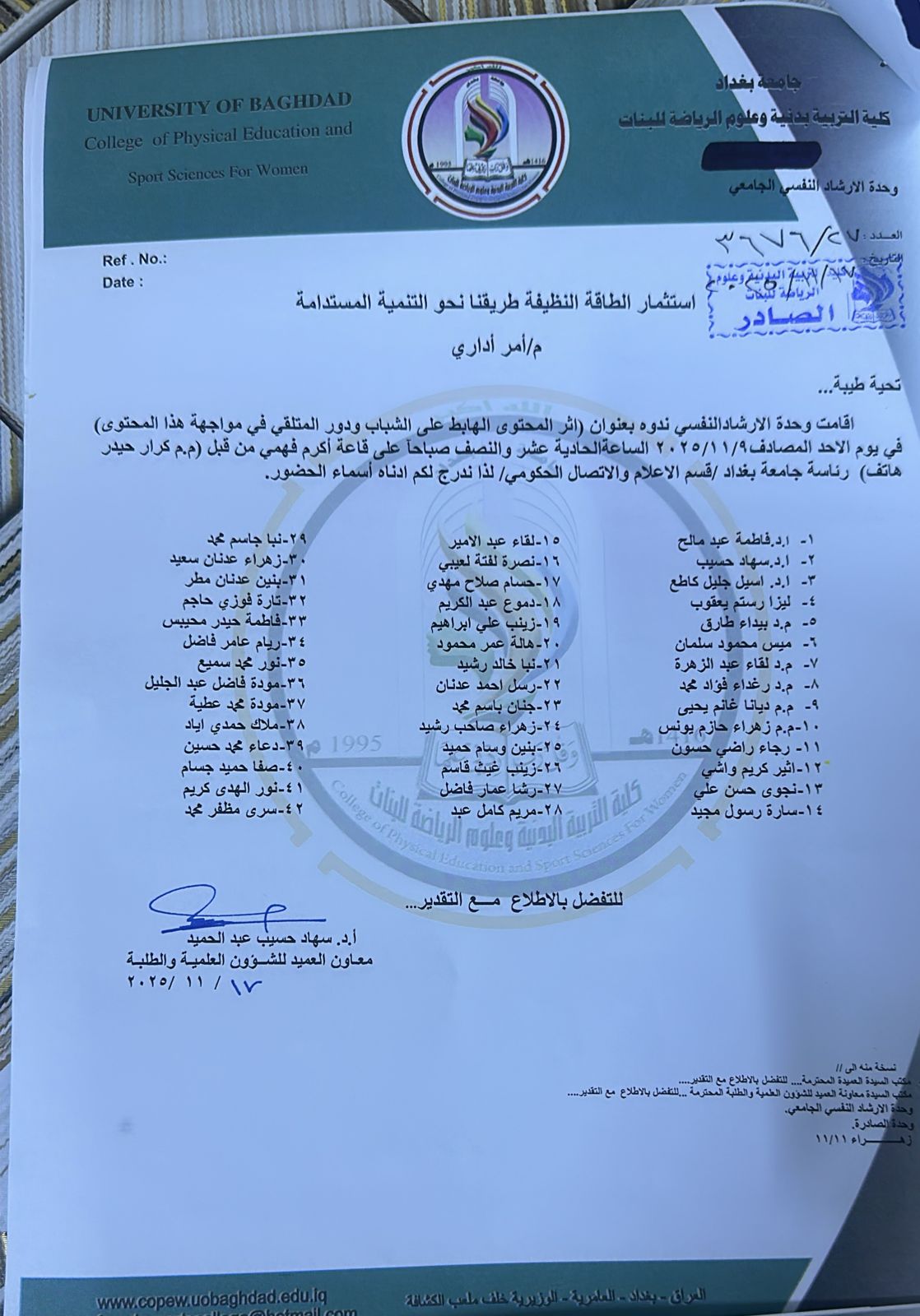 آثر المحتوى الهابط على الشباب ودور المتلقي في مواجهة هذا المحتوى The name of the folder. Description Description of the folder and its content Always Visible By default, folders are always visible, even if a user cannot access them. You can disable this behavior here, hiding the folder for anyone who does not have permission to access it. Protected Access control list This list is currently empty User Group Category Role The list of users and groups allowed to access the folder Public This object is publicly accessible since آثر المحتوى الهابط على الشباب ودور المتلقي في مواجهة هذا المحتوى Start* Navigate forward to interact with the calendar and select a date. Press the question mark key to get the keyboard shortcuts for changing dates. End* Navigate forward to interact with the calendar and select a date. Press the question mark key to get the keyboard shortcuts for changing dates. Timezone* Location Protection mode Public Inheriting Protected Public This event will be publicly accessible since the category الخطة السنوية لوحدة الارشاد النفسي الجامعي is not protected. Cancel (Event) is not protected. Cancel