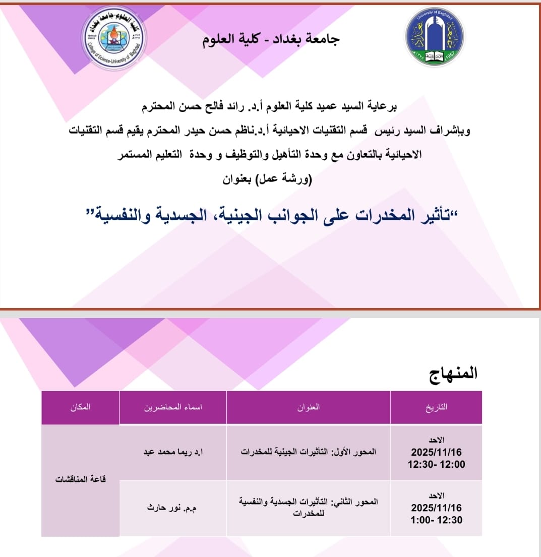 تهدف هذه الورشة إلى تسليط الضوء على التأثيرات السلبية للمخدرات على الجسم البشري من جوانب متعددة. حيث يتم مناقشة الأضرار التي تسبّبها المخدرات على الجوانب الجينية من خلال تأثيراتها على التفاعلات الوراثية، مما قد يؤدي إلى تغيرات مستدامة في الحمض النووي والتوريث.