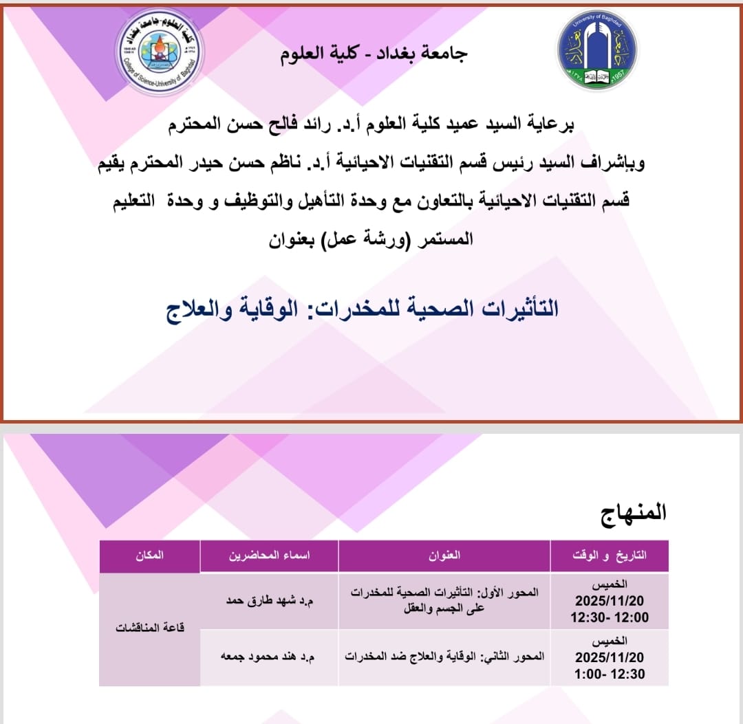 • كيف تؤثر المخدرات على الصحة الجسدية والنفسية على المدى القصير والطويل. • التأثيرات السلبية على الأعضاء الحيوية مثل القلب، الرئتين، والكبد، بالإضافة إلى التأثيرات النفسية مثل الاكتئاب، القلق، والفصام