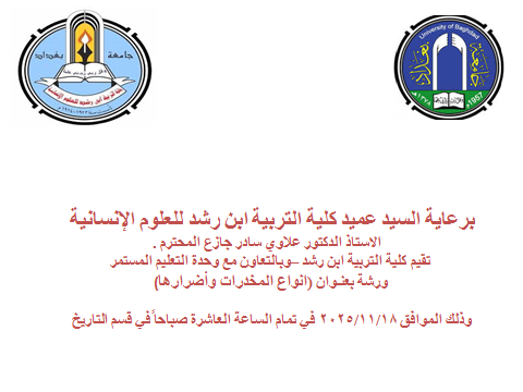 أقامت وحدة الارشاد التربوي وبالتعاون مع قسم التاريخ ووحدة التعليم المستمر في كلية التربية ابن رشد للعوم الانسانية بجامعة بغداد, ورشة حول انواع المخدرات وأضرارها, القاها كل من: أ.د سعاد هادي حسن الطائي, و أ.د سولاف فيض الله حسن, و أ.م.د مها وضاح عبد الامير, وحضرها عدد من تدريسي وطلبة الكلية. هدفت الورشة الى توعية الطلبة على ضرورة الابتعاد عن المخدرات, و توعية الطلبة الابتعاد عن الاقران السوء, اضافة الى تفعيل دور المؤسسات التعليمية والتعاون مع الاسر لحماية ابنائهم من الادمان, و تفعيل دور الامن المجتمعي لضمان سلامة الطلبة والشباب والحد من تعاطي المخدرات. وتوصل المحاضرون من خلال ورشتهم الى عدد من النتائج واهمها: التأكيد على ضرورة دور الاسرة والمؤسسات التعليمية في الحد من اضرار المخدرات, و توعية الطلبة بمخاطر المخدرات عن طريق عقد الندوات والورش, فضلا عن توظيف مهارات الطلبة بالنشاطات الفنية والرياضية, كما وأوصوا بضرورة تفعيل دور الاسرة عن طريق تقديم النصح والارشاد لأبنائهم والتأكيد على ضرورة الابتعاد عن المخدرات والاقران السوء, الى جانب ضرورة تعاون الاسرة مع المؤسسات التعليمية من اجل الحد من تعاطي المخدرات, و تشجيع الابناء على ممارسة نشاطاتهم الرياضية والفنية